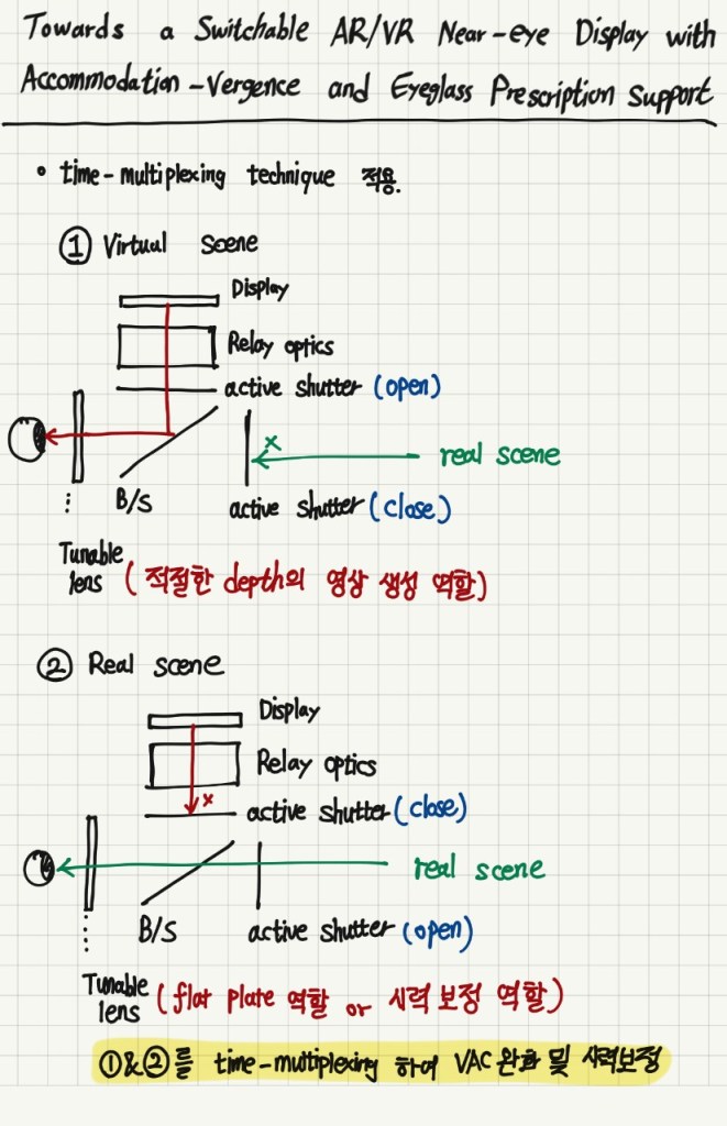 이 논문에서 제시한 AR/VR 모드 변경가능한 NED는 real scene과 virtual scene을 active shutter를 이용해 time-multiplexing하고 사용자에게 보여준다. tunable lens를 이용하여 real scene을 보여주는 frame에서는 시력 보정을, virtual scene을 보여주는 frame에서는 virtual scene의 depth 조절을 수행한다. 이를 통해 VAC를 해결하고, 사용자의 시력도 보정하여 시력이 좋지 못한 사람도 추가적인 안경이나 렌즈가 필요 없이 착용 가능한 AR/VR NED를 구현하였다. focus tunable lens의 aperture가 커지고, refresh rate도 올라가고 하면 할 수록 더 큰 FoV도 획득할 수 있고, vignetting 효과도 많이 완화되고, 지금은 제법 낮은 real scene의 밝기도 올라갈 수 있다고 한다. 맞는 것 같다.