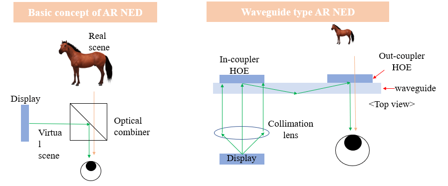 The above figure describes the basic concept of an AR NED and waveguide type NED. AR NED, unlike VR NED, should give both real and virtual scenes to the users. To provide the real scenes, two types are generally used. one is video see-through(VST) and another is optical see-through(OST). the figure is about the OST AR NED which is comprised of an optical combiner and display. As a combiner, we can separate a type into two things, reflective-optics-based and diffractive-optics-based. Examples of reflective-optics-based combiners are Flat beam splitter(B/S), Curved B/S, Birdbath structure, pin-mirror, and partial mirror. Diffractive-optics based include Holographic optical elements(HOE), Diffractive optical elements(DOE) and polarization volume grating(PVG). Generally speaking, light efficiency and image quality are way better when using reflective-optics based, but diffractive optics based is much good at form factor. So many researchers in this field, trying to enhance the image quality, FoV, and eyebox using diffractive-optics-based combiners. In waveguide type NED, diffractive-optics-based combiner is used as indicated in the above figure.