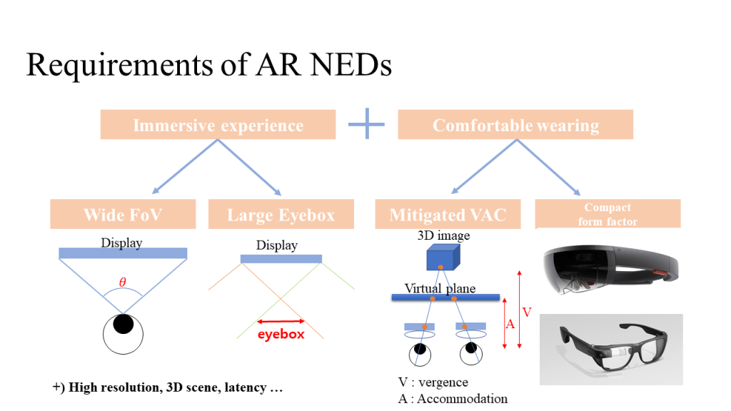 This post is about my understanding of waveguide type near-eye display(NED) optics. let’s start with AR NED’s requirements in the above figure. NED is one of the promising devices for virtual reality(VR), augmented reality(AR), mixed reality(MR), and the metaverse. But products on markets have a small Eyebox and Field of view(FoV), a large form factor, and vergence accommodation conflict which gives users eye fatigue. (FoV is the extent of the observable scene by display and eyebox is the region where all FoV of a display can be observed.) These things do hinder the immersive experience and comfortable wearing of the near-eye display. Among them, the compactness of the NED is the most important part due to the fact that NED is the device users should wear in their heads. On that point, waveguide type NED is a truly promising configuration. To provide wide FoV and large eyebox to users, many suggested methods have to increase their size. However, waveguide type configurations don’t need to. So forerunners in this field like Microsoft and Magicleap use this method.