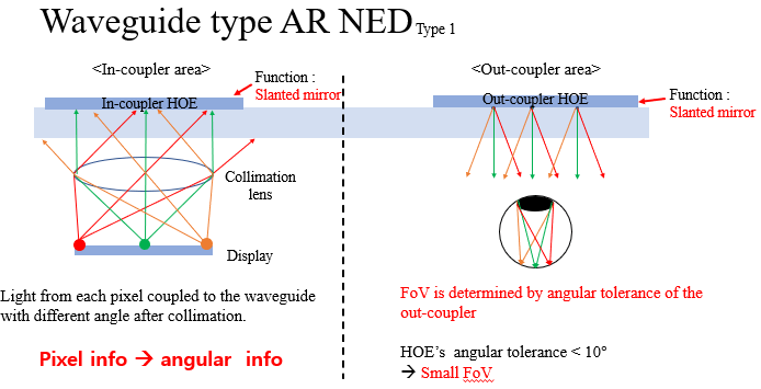 Another type of waveguide AR NED, which is also called maxwellian type NED, is just like the above figure. As I mentioned before, dot shape exit pupil of display is collimated and coupled by in-coupler. Unlike the type 1, this configuration, each pixel information is corresponding to the space information in the waveguide. Therefore, every point of out-coupler HOE has different light information, which means to see the full image, every light must focused to the eye. In this way, FoV can be enlarged but eyebox is shrunk to a spot. Multiplexed HOE can be used for the generation of multiple focal spots which enlarges the small eyebox of this configuration.